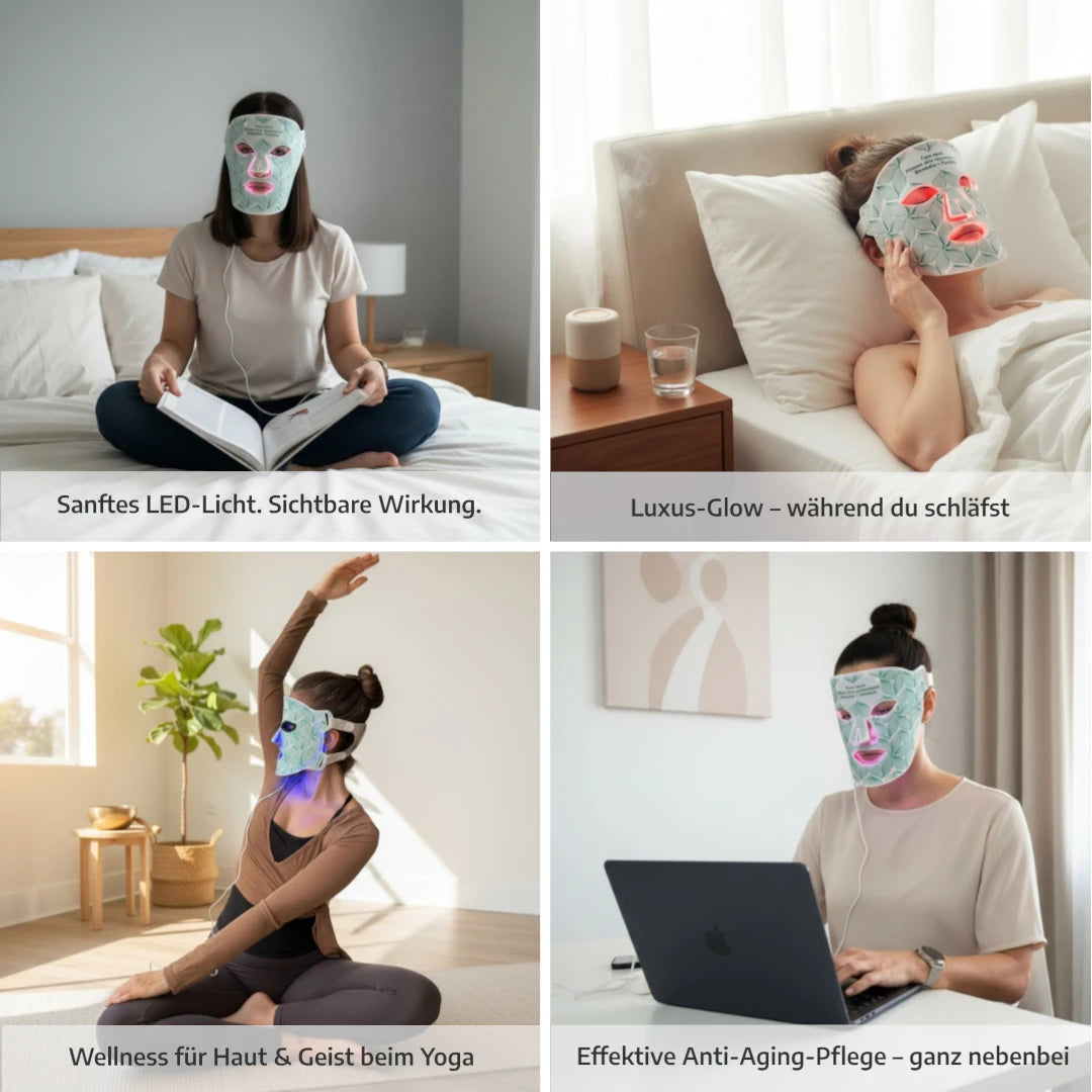 Die LED-Maske setzt auf die belegte Lichttherapie, um die Haut von innen heraus zu stärken. Gezielt eingesetzte LED- und Nahinfrarot-Wellenlängen fördern die natürliche Kollagenbildung, regen die Zellerneuerung an und unterstützen die Regeneration der Haut.